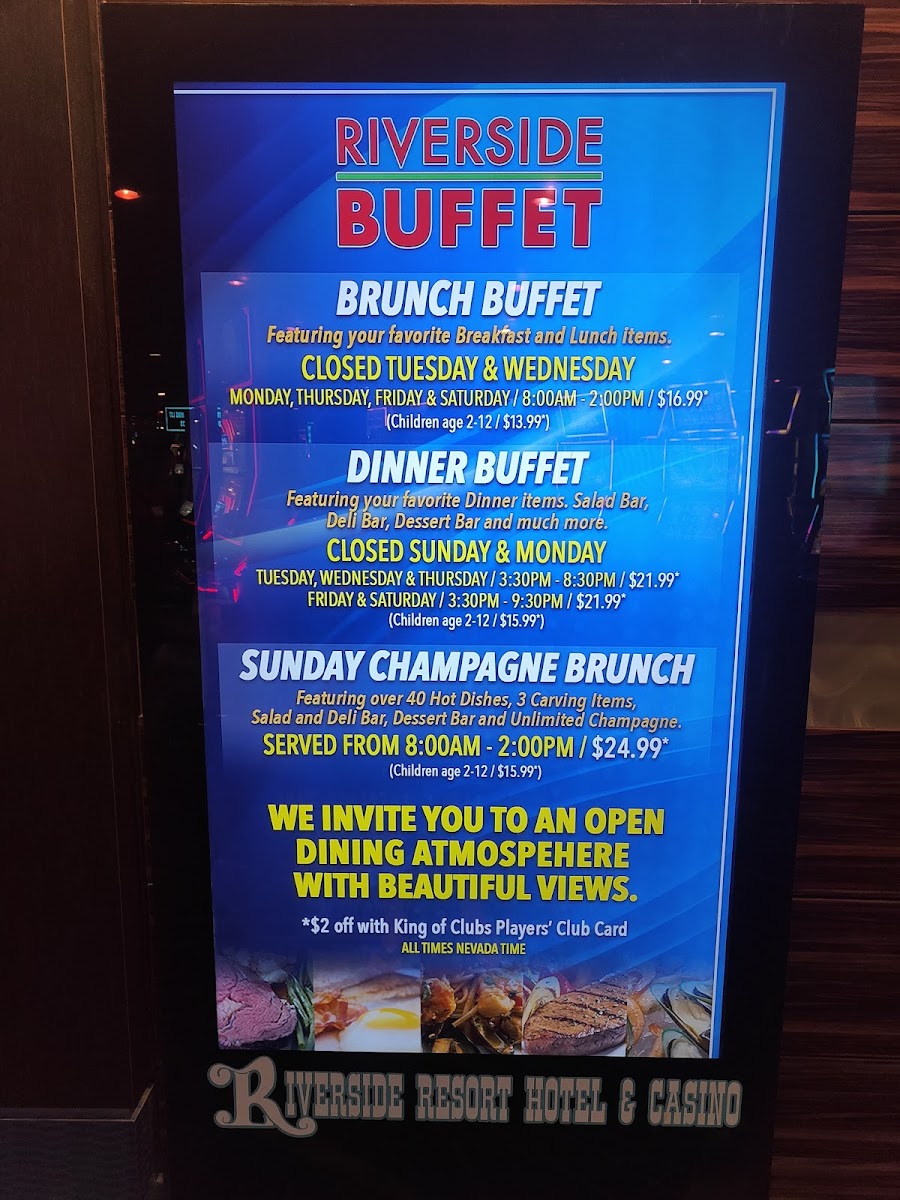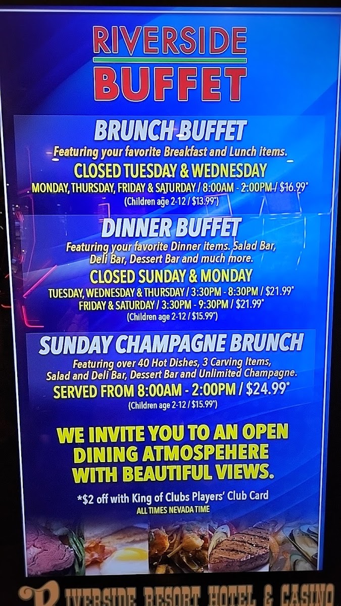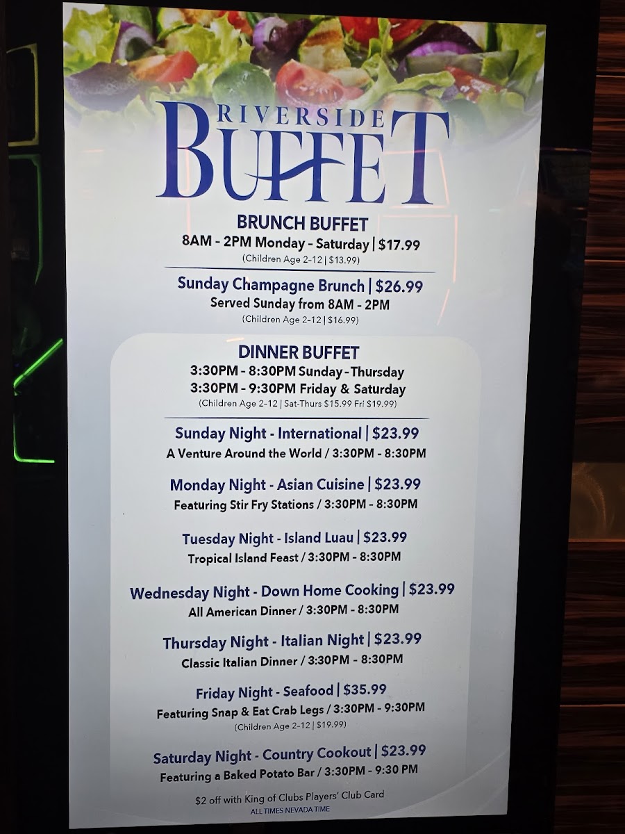 Riverside Buffet offers a diverse and satisfying menu that caters to a wide range of tastes. For those looking for a fresh start, the Salad Bar is an excellent choice, featuring a variety of crisp greens and toppings to create a personalized salad. The buffet also includes a generous selection of hot entrees, from savory roasted meats to flavorful pasta dishes. The variety extends to seafood lovers, with dishes like shrimp scampi and baked salmon making frequent appearances. The carved meats station is always a crowd favorite, where guests can indulge in prime rib or roast turkey. Sides like mashed potatoes and steamed vegetables round out the meal, providing comfort food staples that pair perfectly with any entree. For dessert enthusiasts, Riverside Buffet offers an array of sweet treats, including decadent cakes and fresh fruit. Whether you're in the mood for a light salad or a hearty, indulgent meal, the buffet is sure to have something to please every palate.